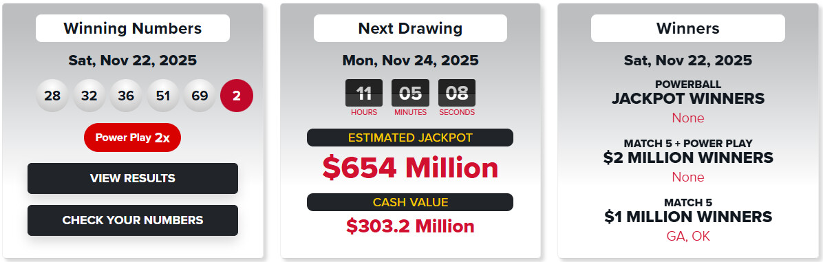 CA주 복권국에 따르면 지난 22일 추첨에서 28, 32, 36, 51, 69 파워볼 넘버 2번 등 여섯 자리 숫자를 모두 맞춘 행운의 주인공은 나오지 않았다.